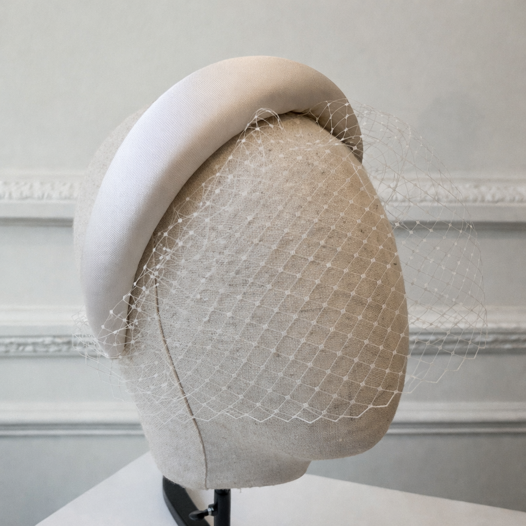 Serre-tête au volume délicatement galbé recouvert de tissu blanc, sublimé par une fine voilette délicatement posée sur le visage. Cette pièce au style résolument chic et contemporain apporte une touche couture et élégante à la silhouette de la mariée.