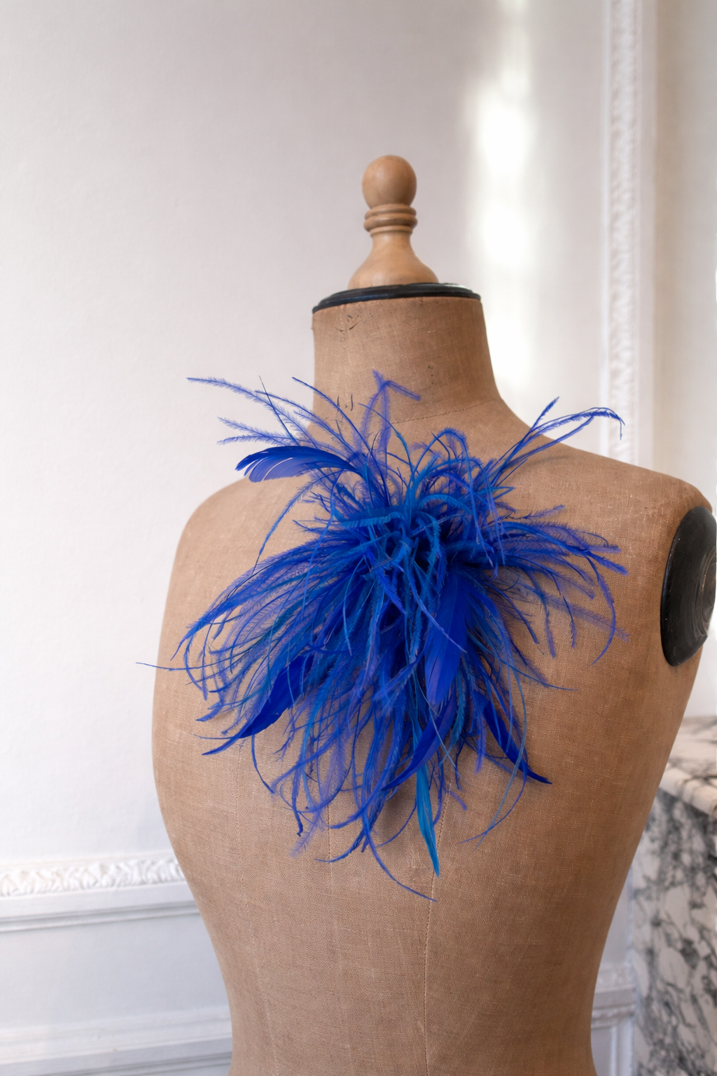 Broche en plume d’autruche bleu roi et plume de coq.