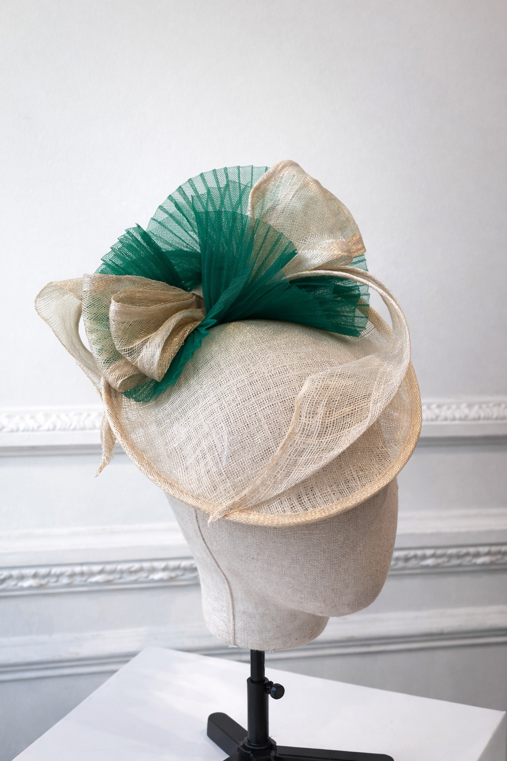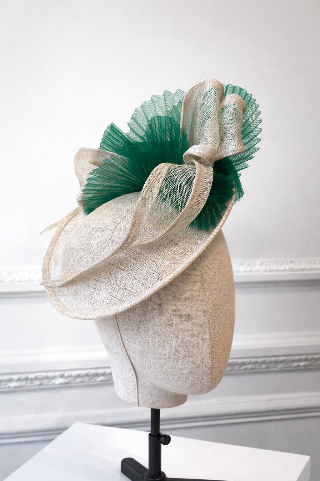 Chapeau plateau (coiffe) à poser sur le côté, en sisal écru et crin vert.